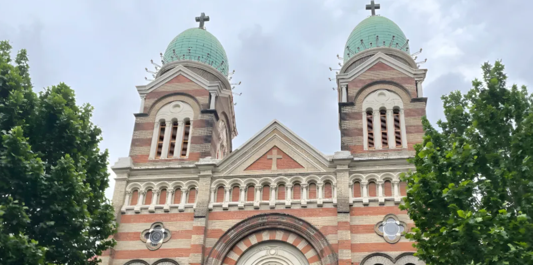 西开教堂是天津市最大的罗马式建筑,建筑平面呈拉丁“十”字形构图,三个高达45米的巨型圆顶错落排列成“品”字形,三座穹窿顶均略向上拉长,表面以绿色铜板覆盖,巨型圆顶为木结构支撑,每座圆顶上有一个青铜十字架。