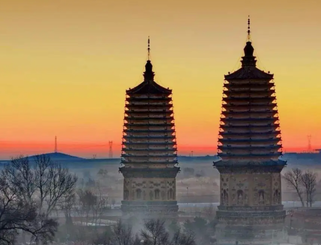 崇兴寺双塔,又名北镇双塔,位冠中国四大双塔之首。崇兴寺双塔创建年代无文献记载,从塔的结构和风格看,应属辽代中晚期的遗物,因塔北有崇兴寺,故此得名。 双塔并立于崇兴寺门外,均为八角13层实心密檐式青砖砌筑。双塔东西相对,相距43米,东塔高43米,西塔高42米,均为八角十三层密檐式实心砖塔。基座每面宽7米,基座上雕有各种花纹,下部雕有狮子、负重力士和莲瓣。向上为仰莲座,座上承托塔身,塔身每面有拱龛,内雕坐佛,外立侍卫,上饰华盖、飞天和铜镜。塔檐十二层,由下至上逐层内收,每层檐角俱挂有风铃,随风摇动,声音清脆悦耳。塔顶的莲花座、宝瓶、鎏金刹杆、宝珠、相轮均保持得相当完好。西塔的中部还镶有明万历二十八年(1600年)《重修崇兴寺塔记》小石碑。 是中国辽代密檐式砖塔的重要实例。